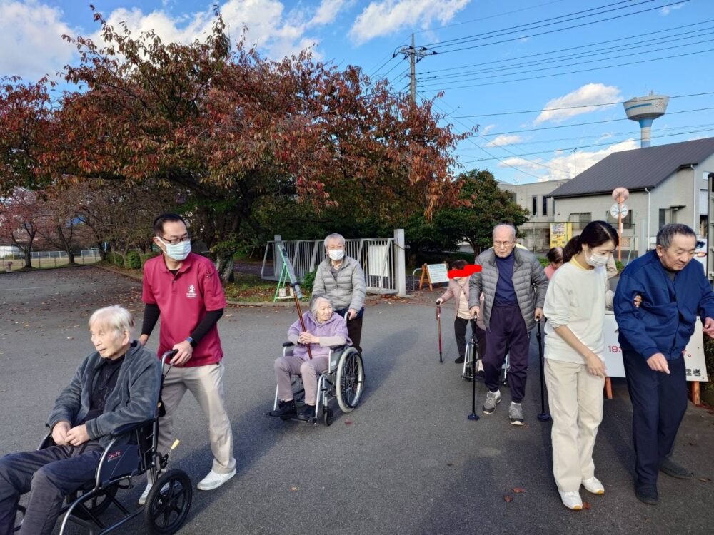皆さまは普段、フロア内で歩かれていますが、屋外での歩行はフロア内とは異なり転倒のリスクも高くなります。安全に配慮しながら散策を楽しむことができました。