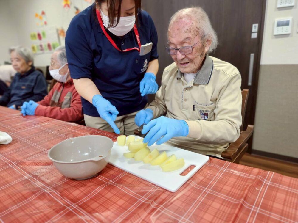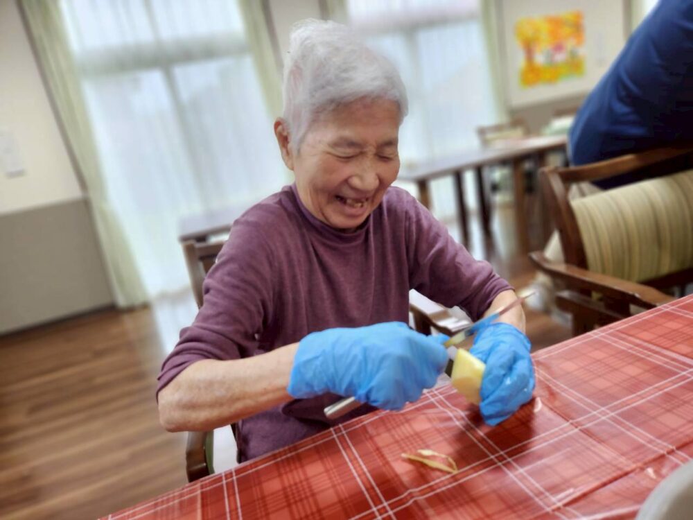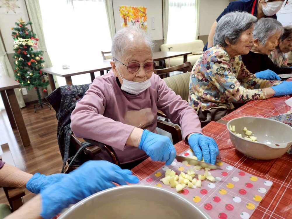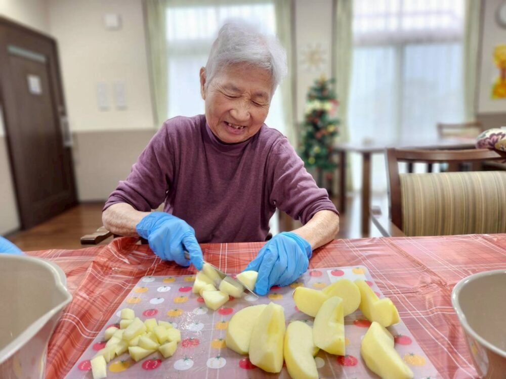 今回のおやつレクリエーションでは、旬のリンゴをふんだんに使用したアップルパイを作りました。甘い香りに包まれて、和やかな雰囲気をお客様の笑顔とともにご紹介いたします。
