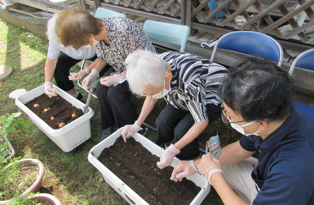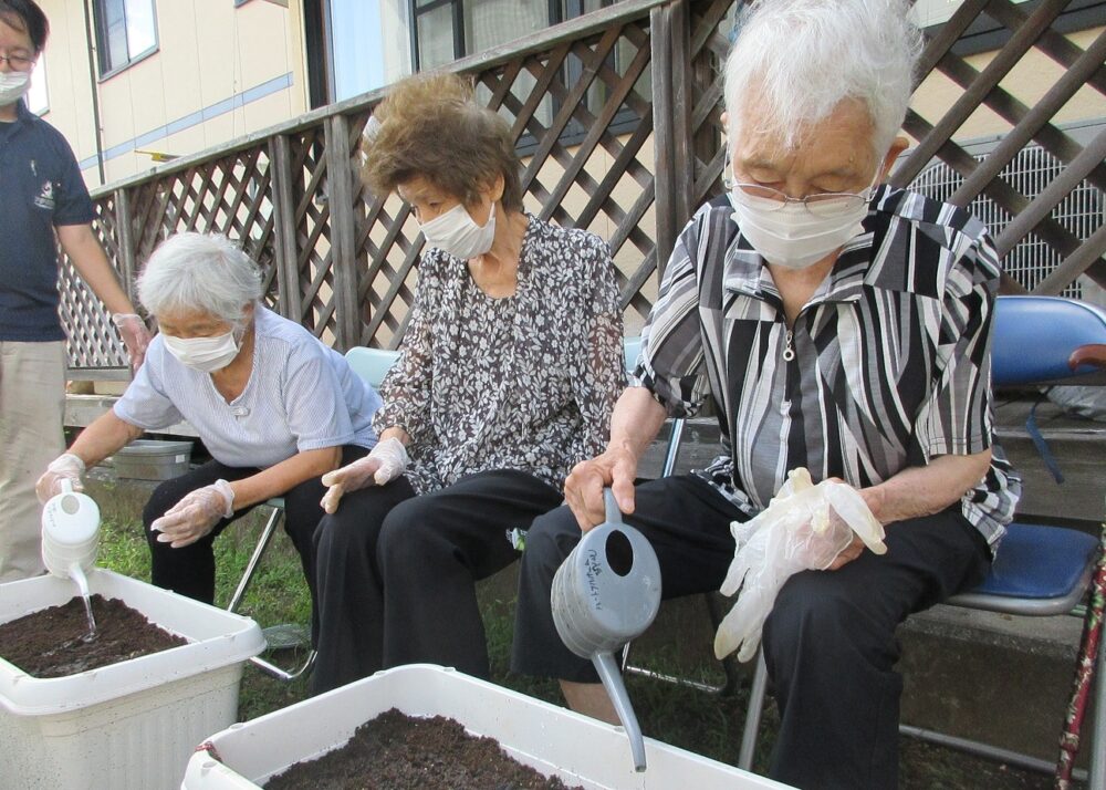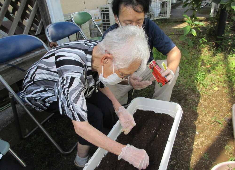 今回は、お客様それぞれに役割を分担していただき、作業を進めました。植え付け作業は大変な面もありましたが、参加されたお客様同士楽しそうな様子が見うけられました。また、水やりなどの管理もお客様自身に行っていただいており、日々の成長を楽しみにされているご様子が伺えます。今後も、季節に応じたレクリエーションや生活リハビリを通して、お客様の生きがいや楽しみに繋がるよう、継続して取り組んでまいります。