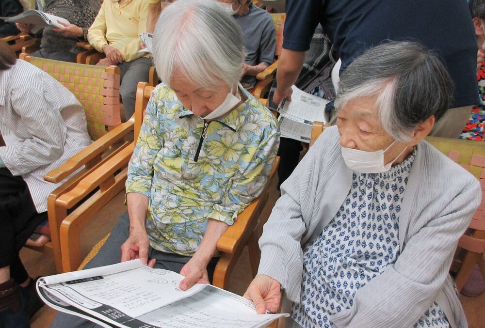 最後には、お客様と職員とが一緒に懐かしの曲を合唱いたしました。「子どもが小さい時に一緒に歌ったよね」と昔を振り返りながら語られる場面もあり、温かい雰囲気に包まれました。こうして、お客様と共に思い出を重ねることができ、心に残る敬老の日のレクリエーションとなりました。