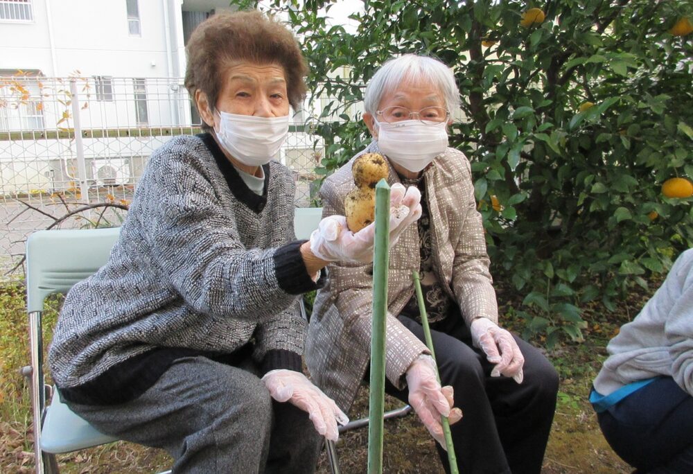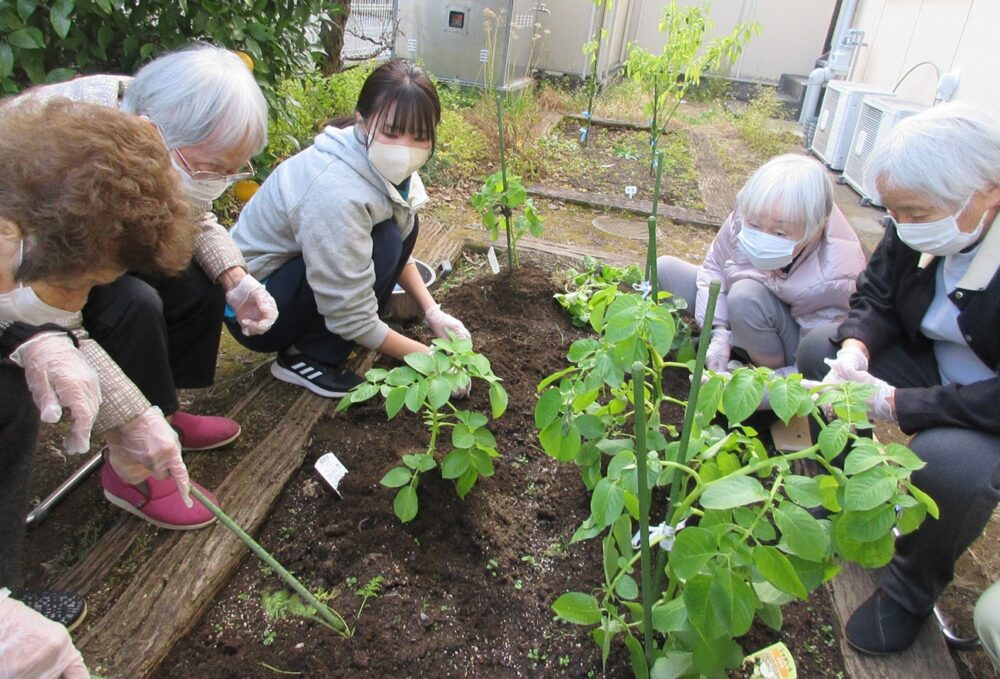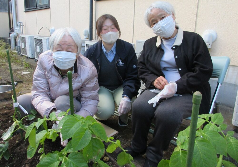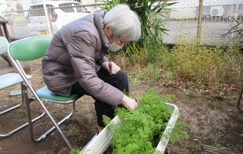 今回は、お客様を主体として収穫活動に取り組んでいただきました。日常の活動の中では、水やりや雑草取りなどの育成管理もお客様ご自身に行っていただいており、植物の成長を日々楽しみにされているご様子がうかがえました。収穫の場面では、これまでの積み重ねやお客様お一人おひとりの取り組みが実を結ぶ形となり、そのお姿をそばで見守る職員にとっても、喜びを感じるひとときとなりました。今後も、季節に応じたレクリエーションや生活リハビリを通して、お客様の生きがいや日々の楽しみにつながるよう、職員一同、継続して取り組んでまいります。