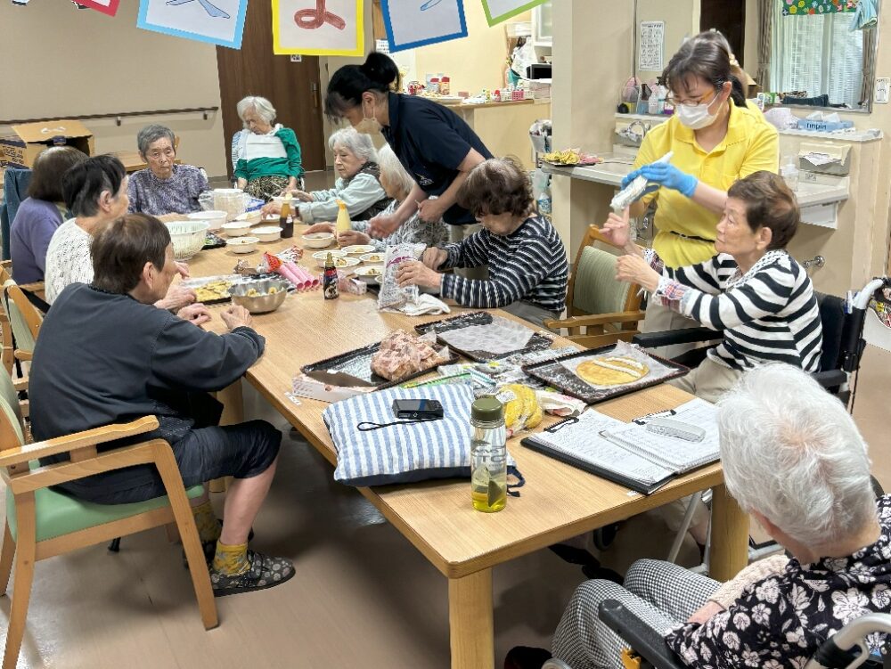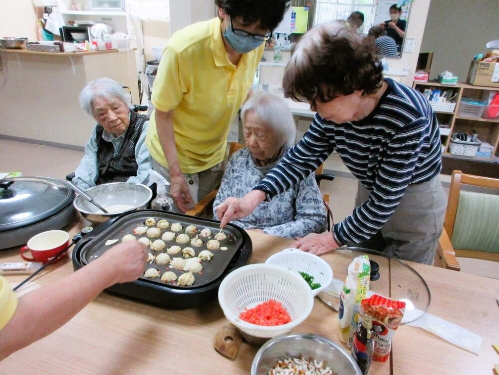 たくさん召し上がれるお客様は、おかわりもしてくださいました。たこ焼き作りは今年度2回目ですが、「前回より上手くできたね」と両方参加した職員も上達を実感し、お客様からも「おいしいよ」とご好評をいただきました。