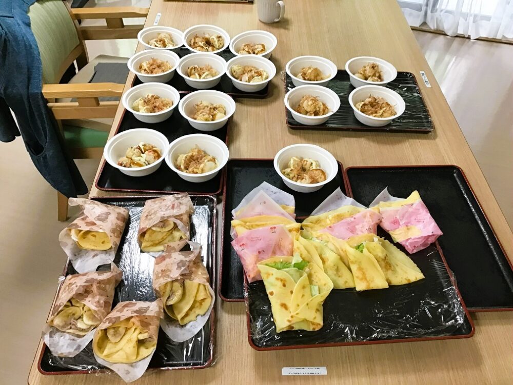 たこ焼きはタコのかわりに竹輪を入れました。クレープはバナナ・ホイップのおやつ系とキュウリ・ハム・レタスの食事系の2種類を用意しています。手際の良いお客様のおかげで、どんどん出来上がりました。