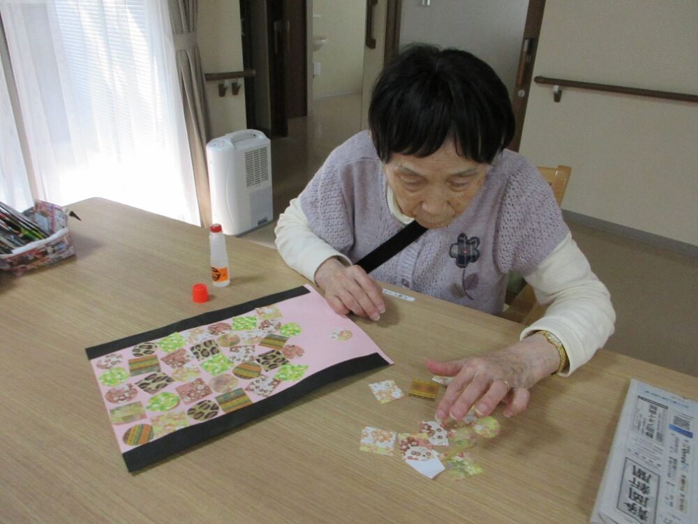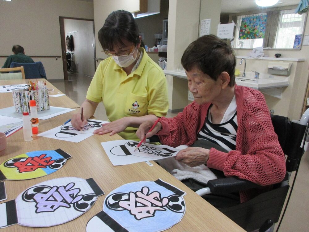 お祭りの雰囲気を演出するための提灯飾りは、お客様と一緒に準備しました。お客様には提灯の絵を塗り、形に沿って切って頂く作業をお願いし、貼り合わせやヒモに繋げて吊るす作業は職員が行いました。