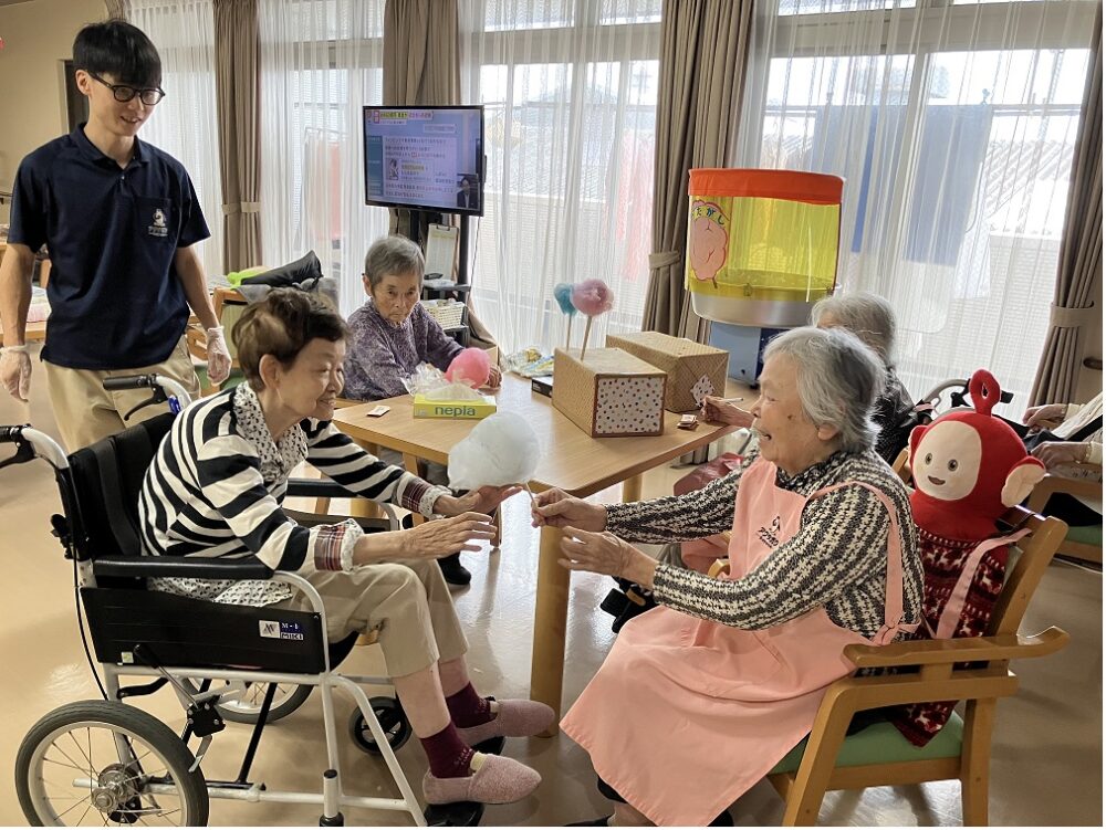 午後は輪投げと的当ての運動レクリエーションと、綿菓子とポップコーンのおやつレクリエーションを1階2階で同時進行しました。綿菓子はマシンを使って綿菓子を作る作業を職員が担当し、「店員役」はお客様にお願いしました。出来上がった綿菓子を手渡していただき、笑顔の交流もありました。