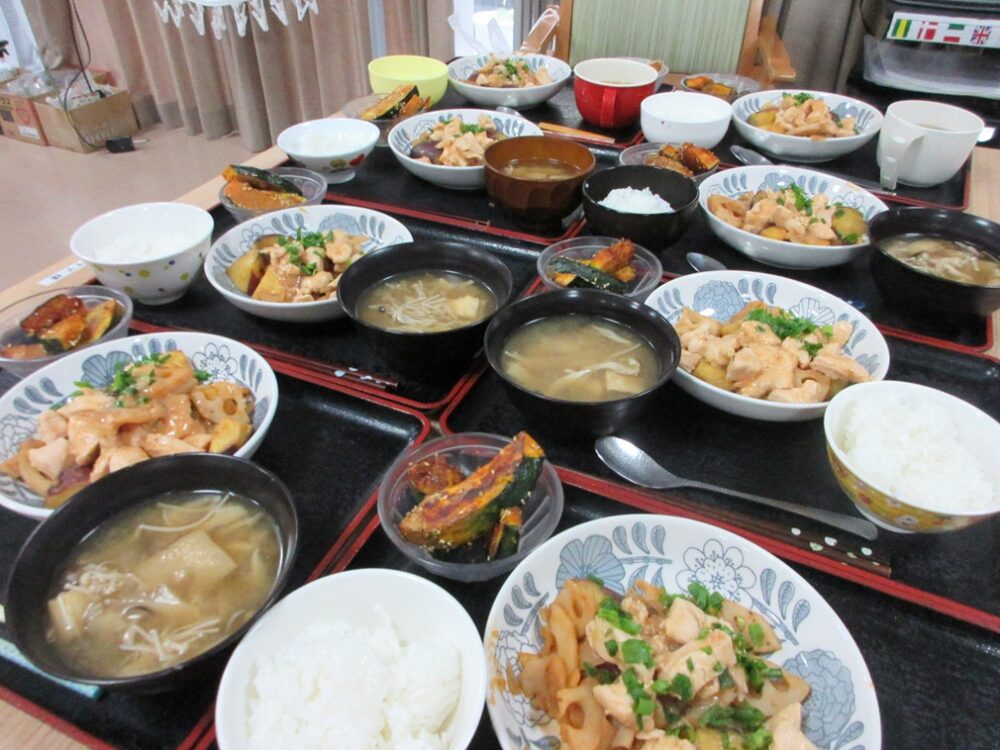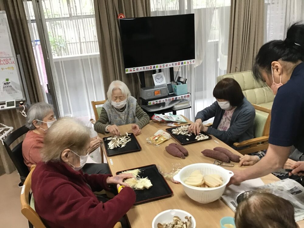 11月の料理クラブでは、サツマイモ・レンコン・鶏むね肉の甘酢あん、カボチャの甘辛焼き、キノコ汁といった「秋の味覚」を意識した昼食を作りました。硬い根菜を切り分けるのは皆さん苦戦するご様子もありましたが、「立った方がチカラが入るね」と途中から立ち上がって包丁やハサミを使うお客様もいらっしゃいました。