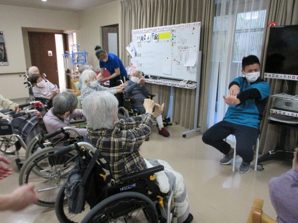 アクタガワの理学療法士(PT)による青空体操ですが、冬季は室内での実施を基本としています。11月は、当社オリジナルの体操DVDに登場するPTが来所しました。この体操DVDで日々身体を動かしているお客様からは「○○さんだ」と声を掛けるご様子もありました。