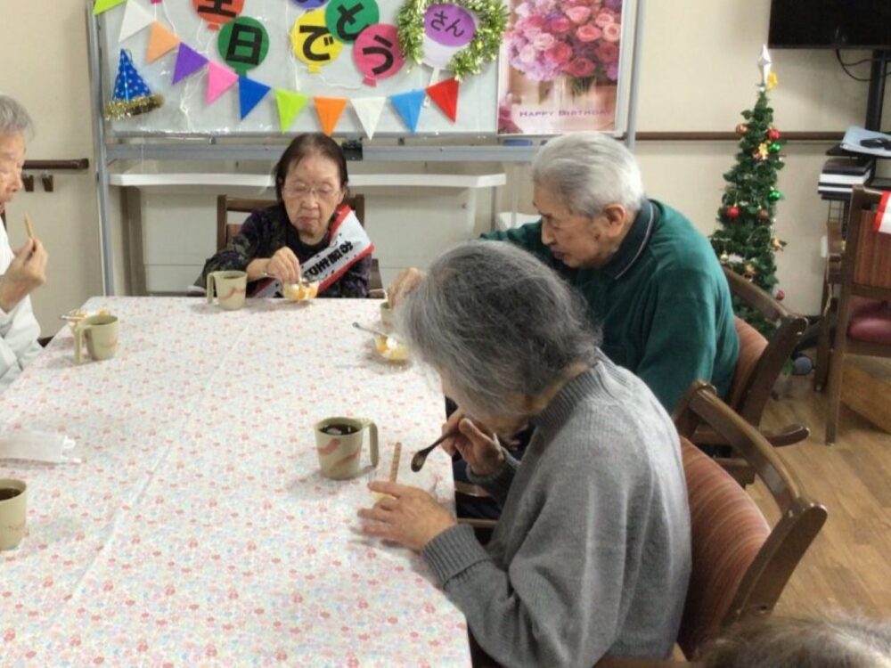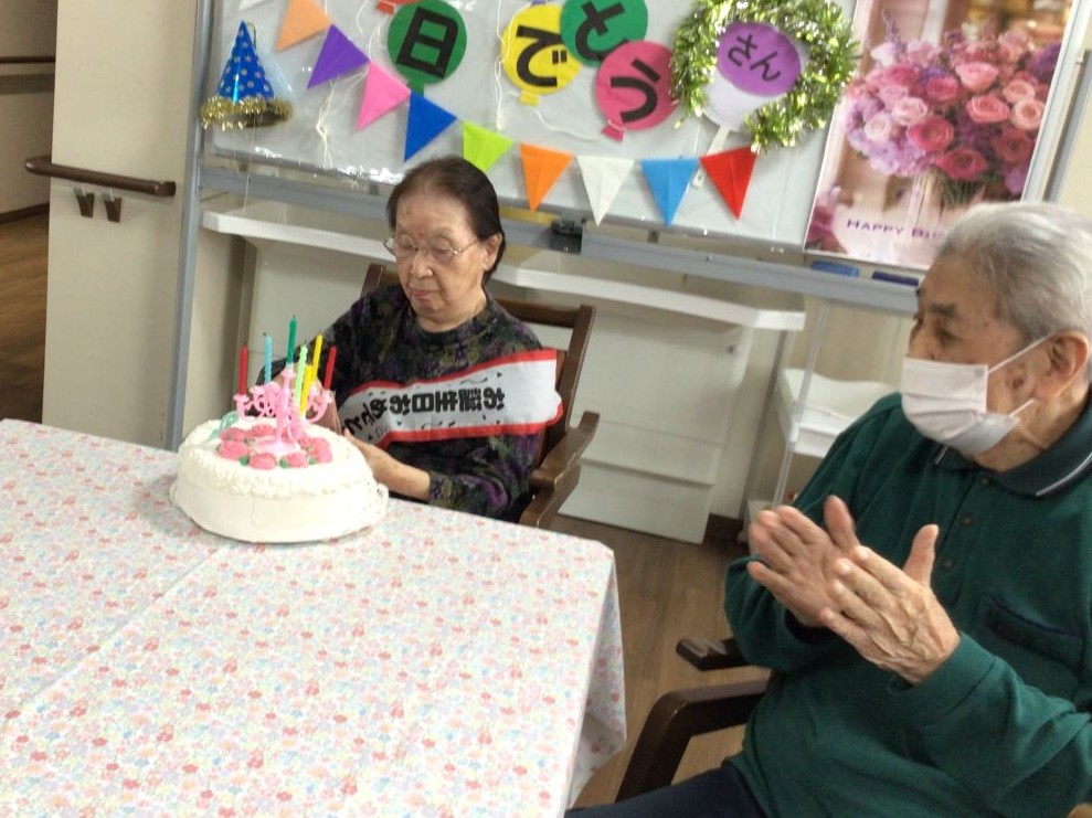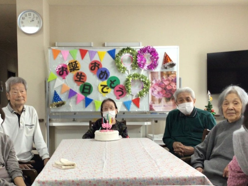12月のお誕生会を開催しました。大きなケーキ(もちろん食べられません)を前に、皆さんで歌のプレゼントを贈ると、主役のお客様は少し照れくさそうにはにかんだ表情を見せてくださいました。