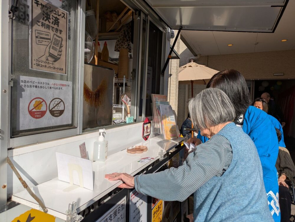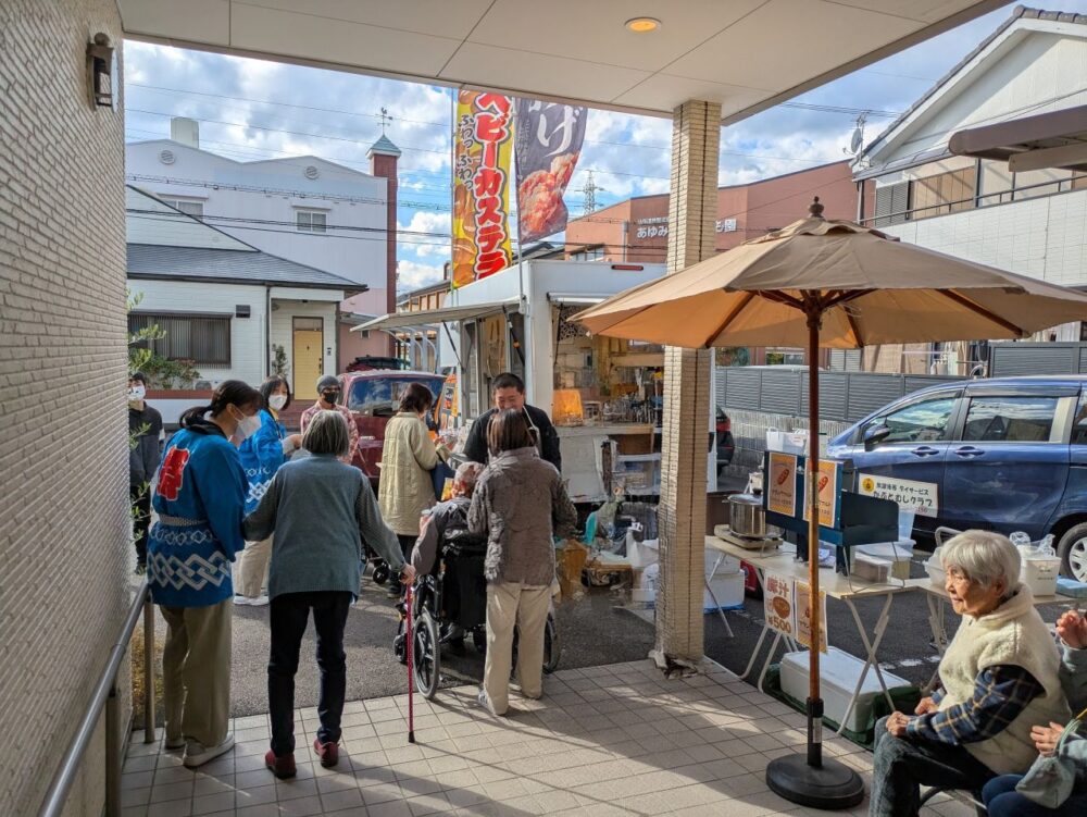 職員のつながりがあって、放課後デイサービス「かぶとむしクラブ」が運営されているキッチンカーを呼ぶことができました。当日はとてもいい天気で外にいても暖かく、キッチンカー日和といった天候で、皆様が思い思いに好きな場所で楽しんでいただきました。メニューを見ながら何にするか考えて、わくわくしながらご自分で注文されていました。