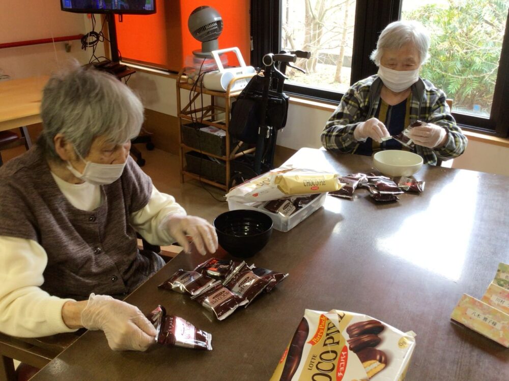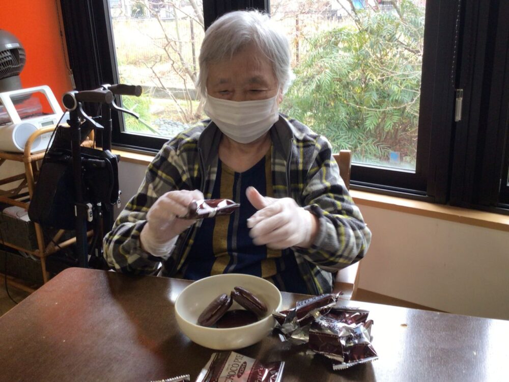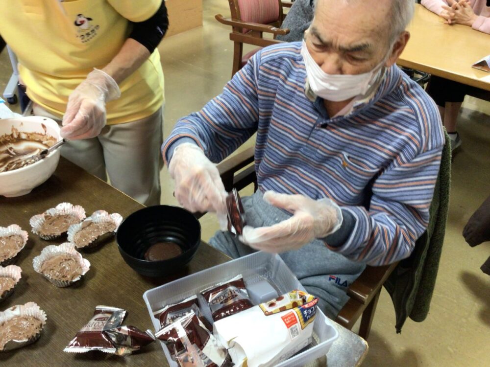 小鹿公園前小規模多機能では、バレンタインデーに合わせてチョコをお客様に手作りして頂きました。出来上がった2種類のチョコレートはおやつに召し上がって頂きました。