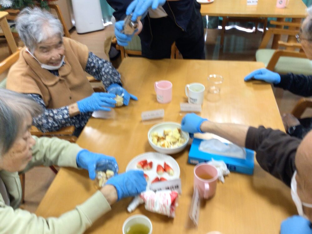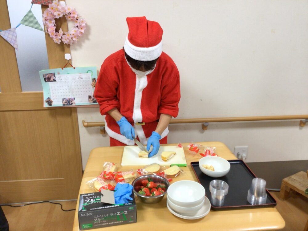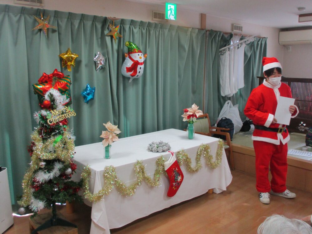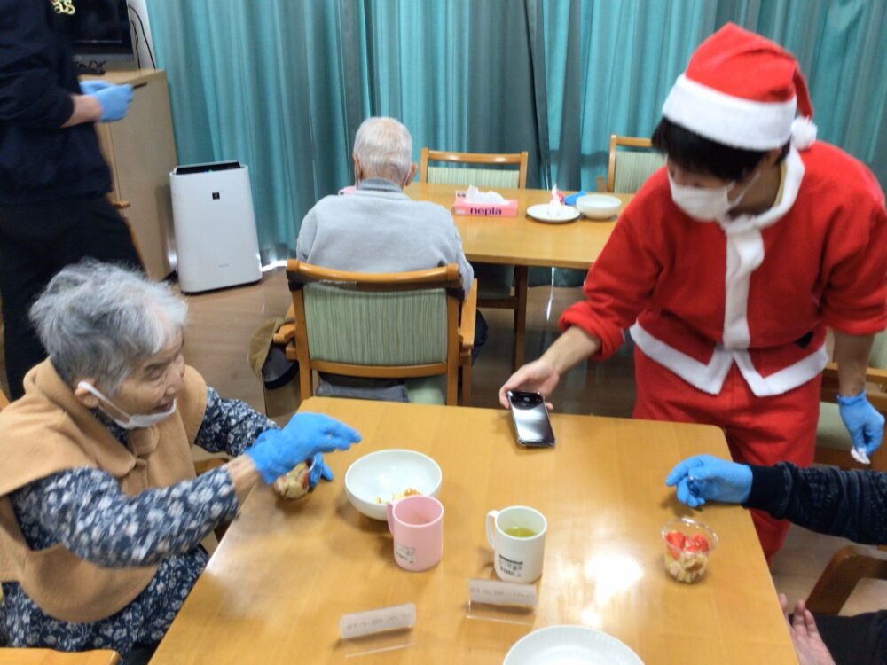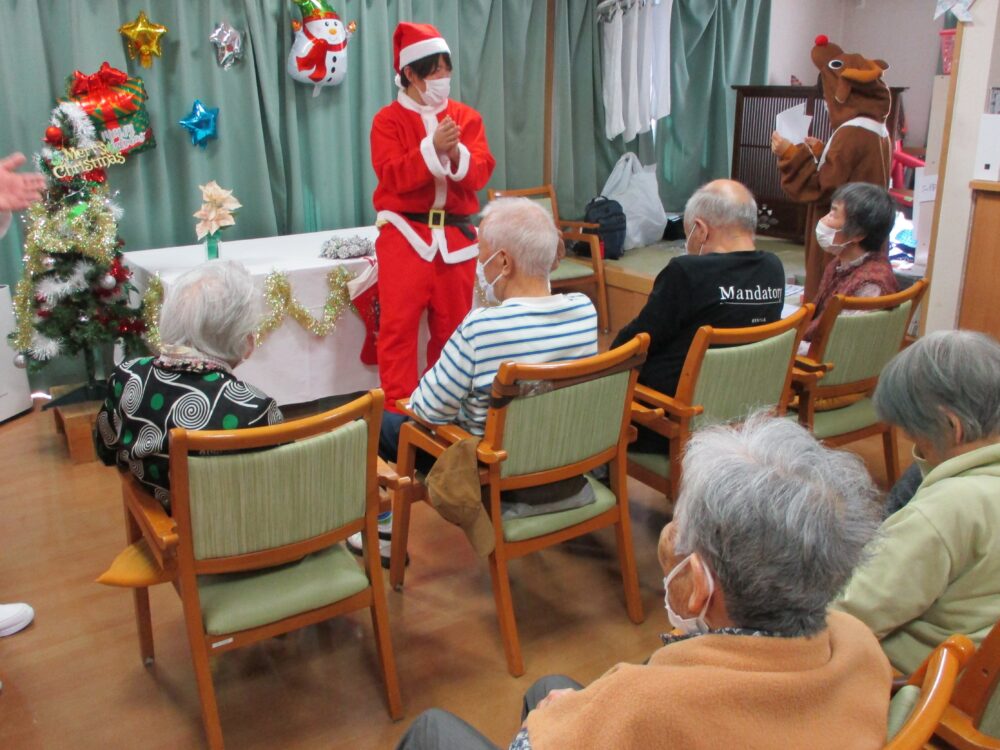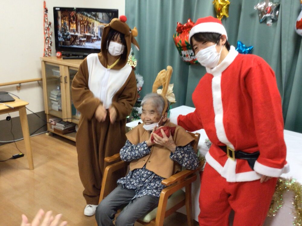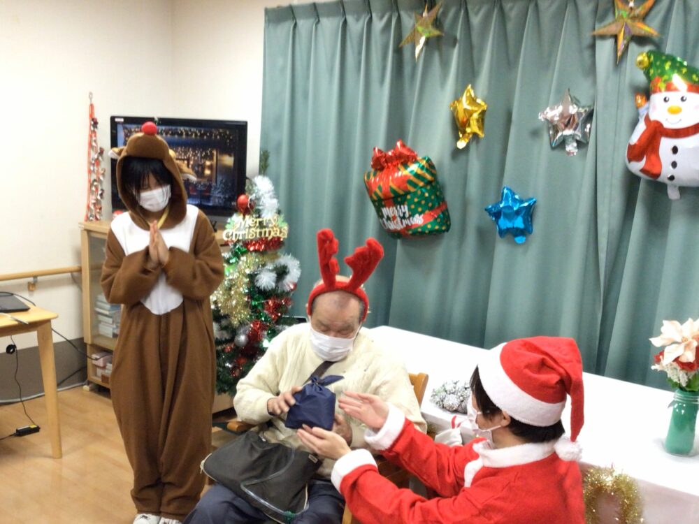 クリスマス会では職員だけが仮装を行いました。お客様からは「かわいいね!私も着てみたい。」等の声も聞かれ今後はお客様にも仮装をして頂こうかなと思いました。プレゼントをお渡しする時には皆さん「何がもらえるのかな」と目をキラキラさせながら待っている様子でした。