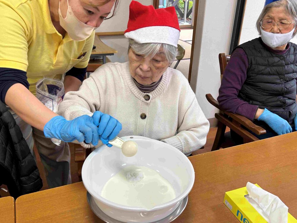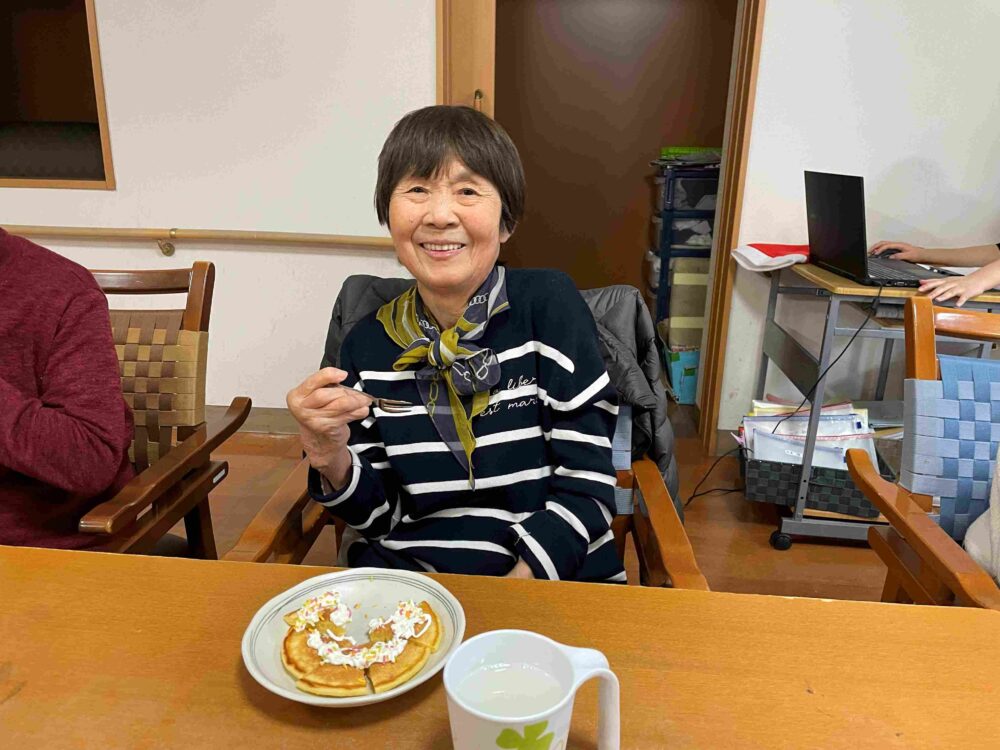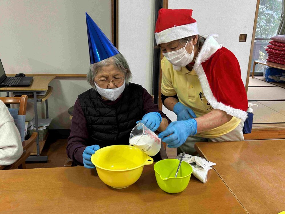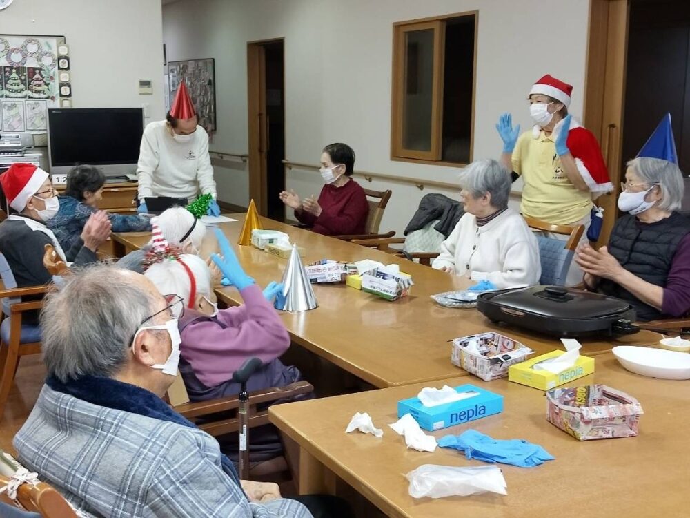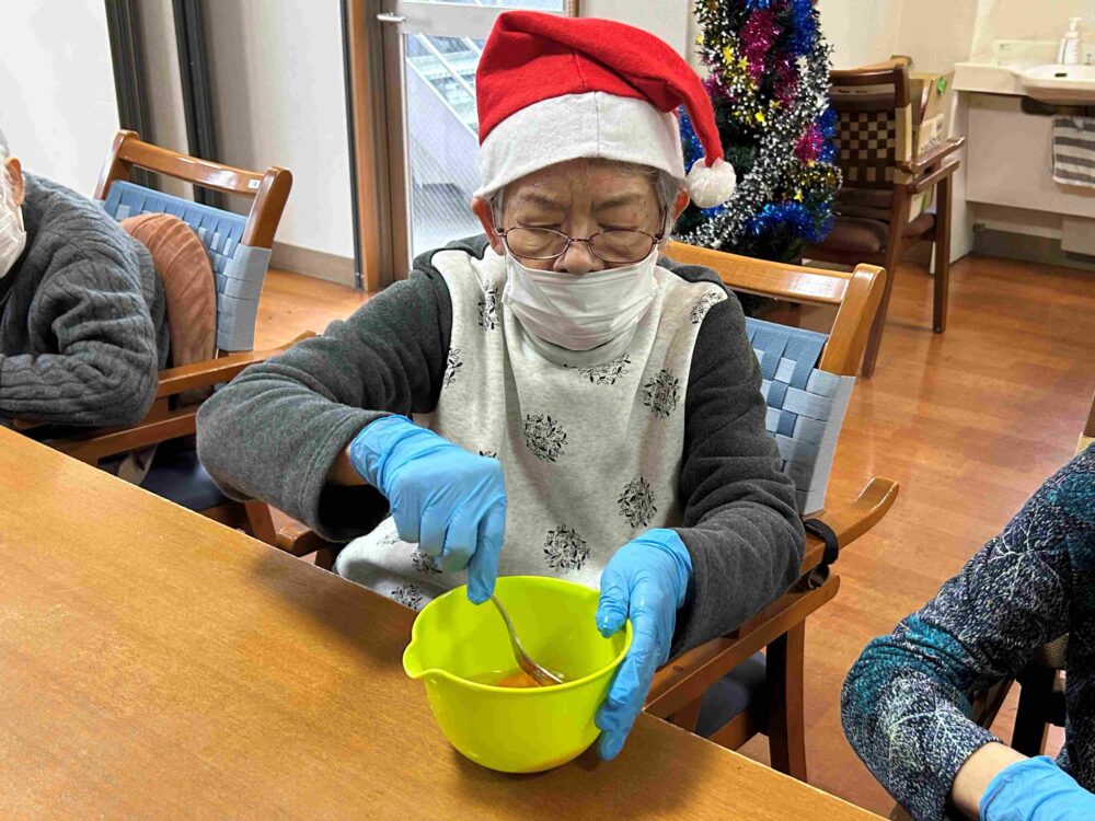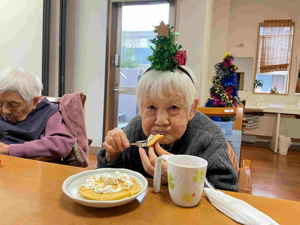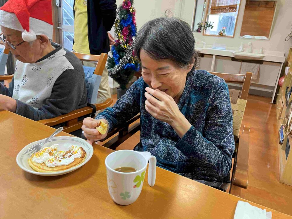 完成したパンケーキを口いっぱいに頬張る方もおり、「美味しい」と大好評でした。笑顔あふれる楽しいクリスマスレクリエーションとなりました。