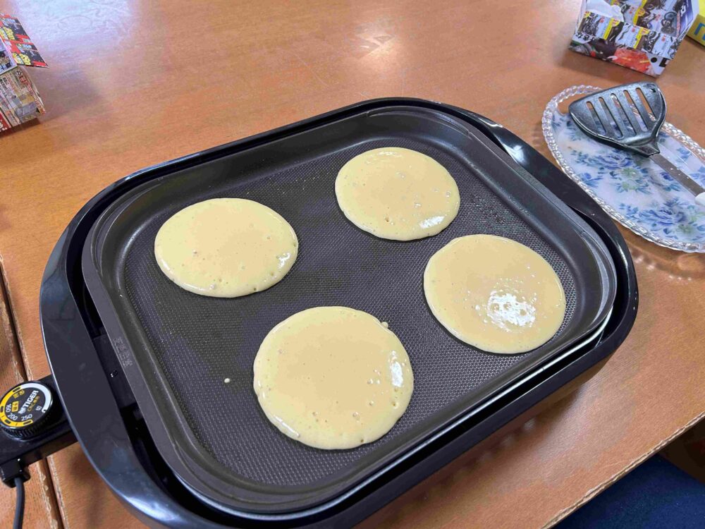 綺麗な丸になるように気を付けながら、ホットプレートへ生地を流しました。