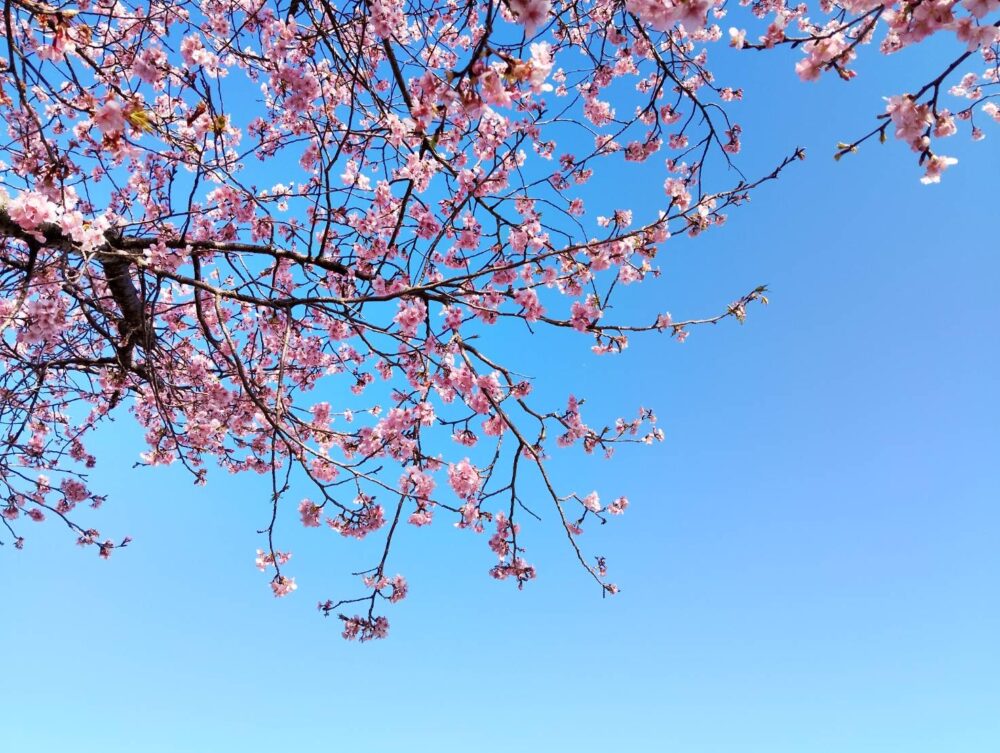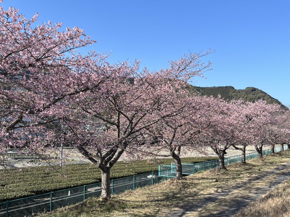 2月中旬。横一列に咲く満開の美和桜です。柔らかな日差しに照らされ、香りと色彩に包まれた景色は、心を穏やかにし、自然の力を感じさせてくれます。