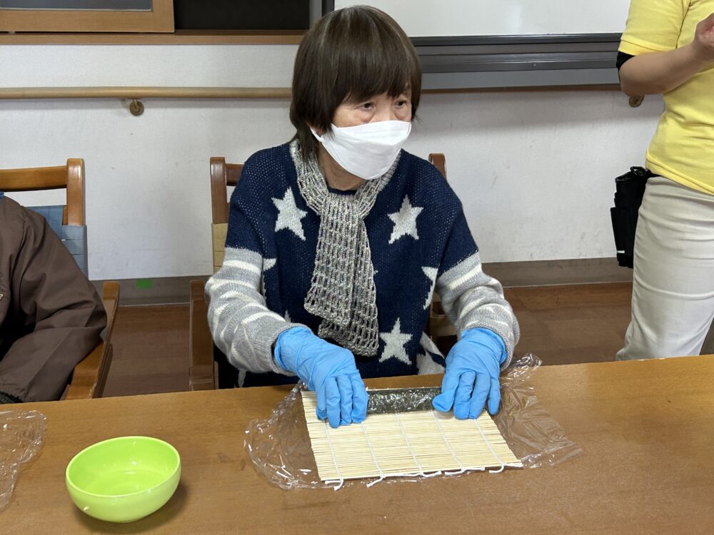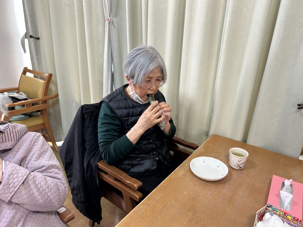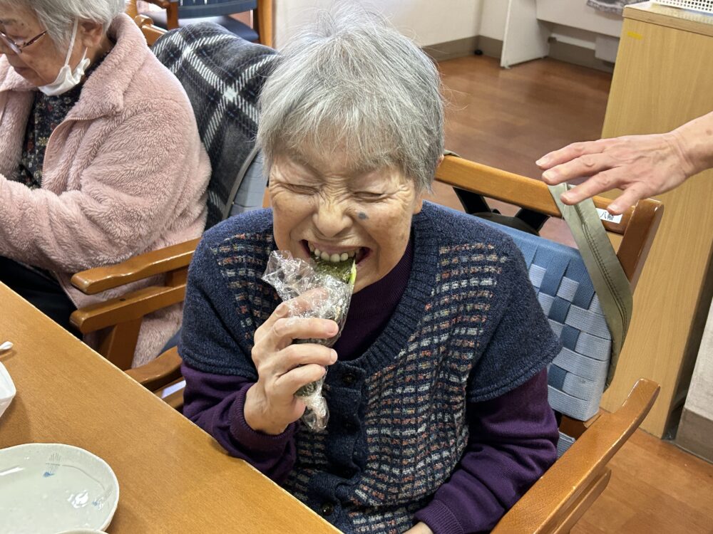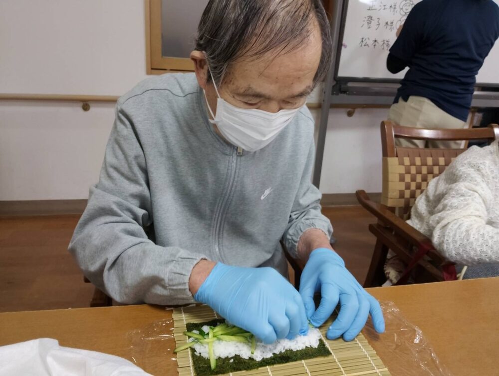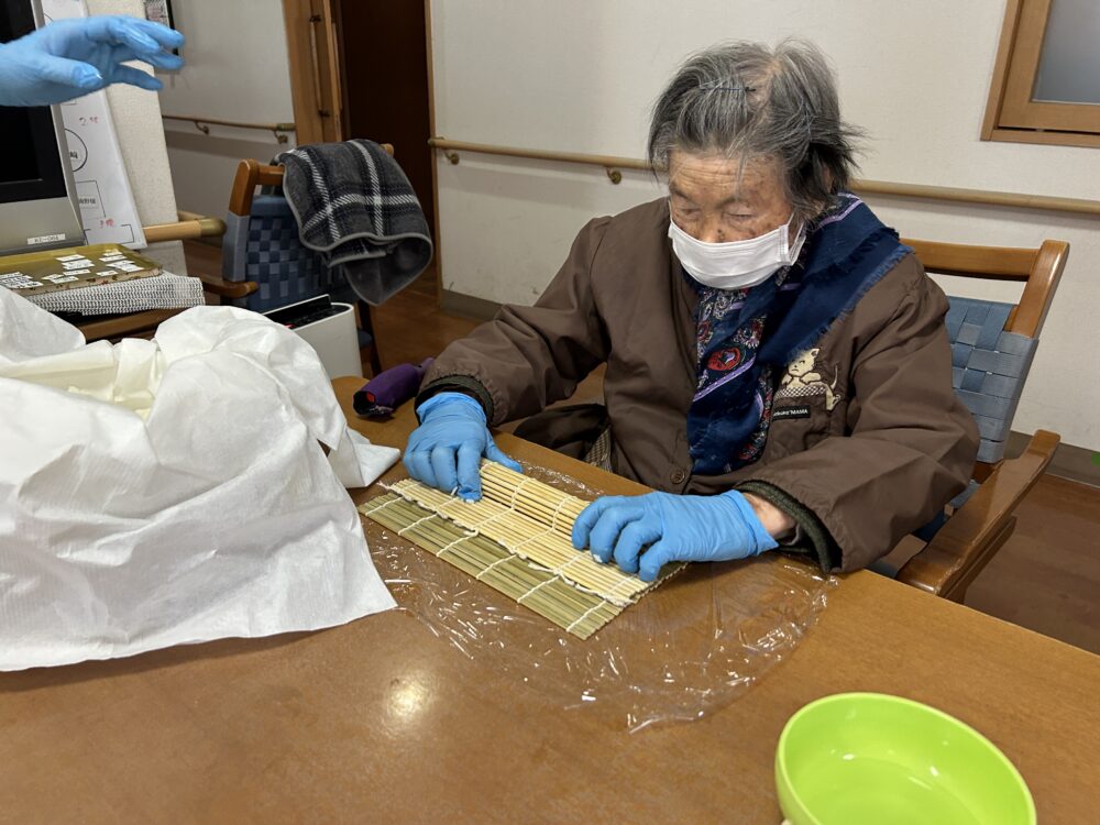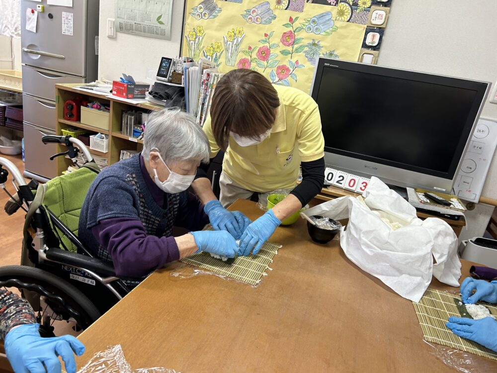 ご自分で恵方巻を作り食べるのが初めてという方が多くびっくりしましたが、とても手際よく作ってくださいました。「おいしかった!」と皆さん喜んで下さり良かったです。施設を利用していると食事を作る機会も減ってきますが、八幡小規模では季節の食事やおやつを定期的に作っています。また自宅での生活が一日でも続くよう、施設の掃除や洗濯等もお客様と一緒に行っています。