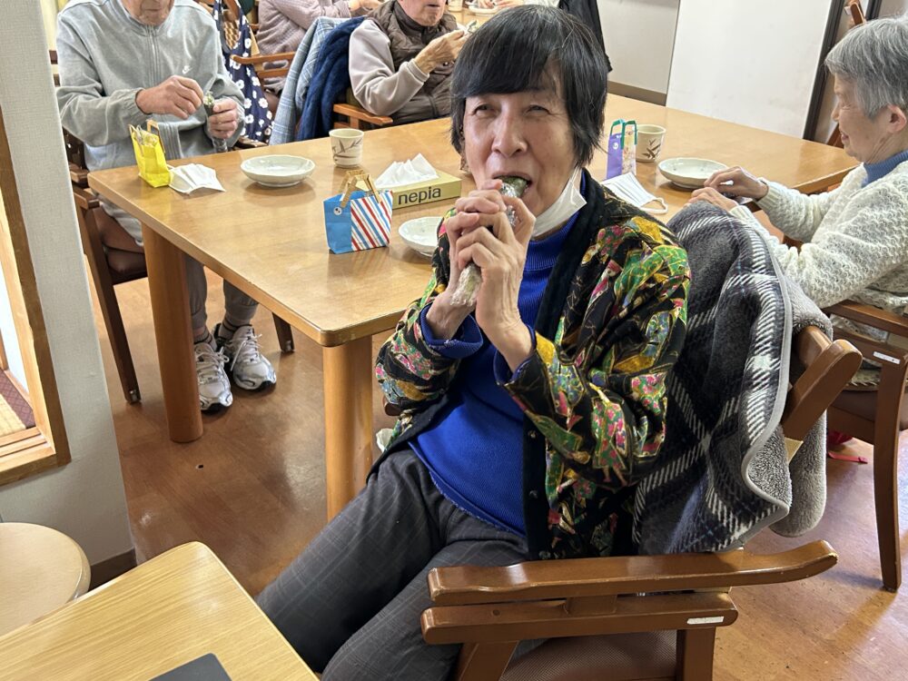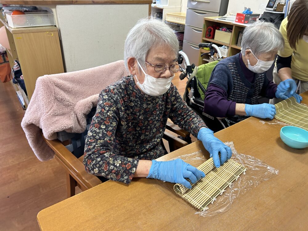 ご自分で恵方巻を作り食べるのが初めてという方が多くびっくりしましたが、とても手際よく作ってくださいました。「おいしかった!」と皆さん喜んで下さり良かったです。施設を利用していると食事を作る機会も減ってきますが、八幡小規模では季節の食事やおやつを定期的に作っています。また自宅での生活が一日でも続くよう、施設の掃除や洗濯等もお客様と一緒に行っています。